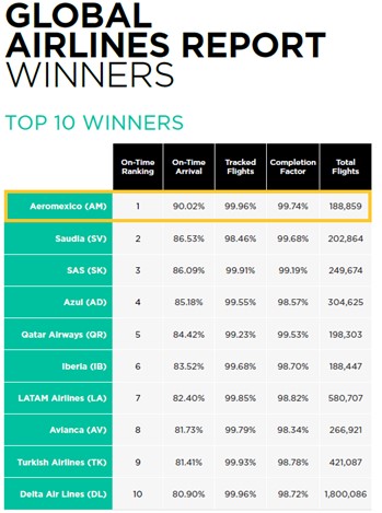 En la clasificación mundial, que agrupa a las aerolíneas con mayor volumen de Asiento-Kilómetro-Disponible (ASK) y operaciones en al menos tres regiones, Iberia comparte el top ten con compañías como Aeroméxico, Saudia, SAS, Azul, Qatar Airways, LATAM Airlines, Avianca, Turkish Airlines y Delta Air Lines.